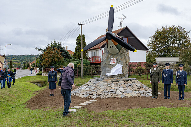 Letecké eso druhé světové války Josefa Františka připomíná od soboty v jeho rodných Otaslavicích na Prostějovsku originální pomník. (5. října 2024)