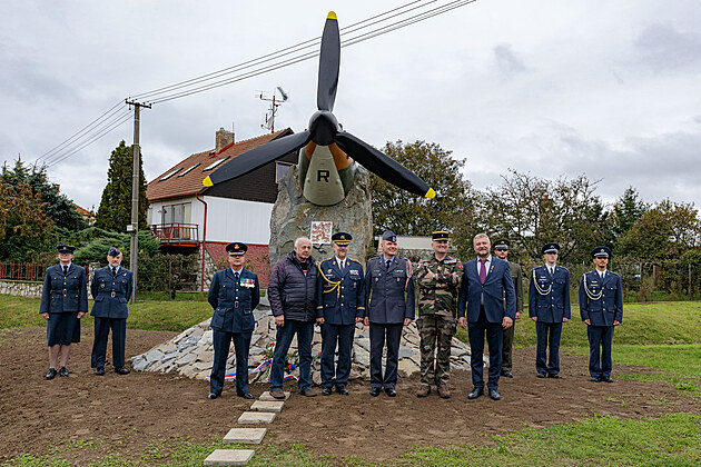 Letecké eso druhé světové války Josefa Františka připomíná od soboty v jeho rodných Otaslavicích na Prostějovsku originální pomník. (5. října 2024)