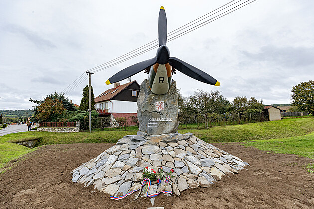 Letecké eso druhé světové války Josefa Františka připomíná od soboty v jeho rodných Otaslavicích na Prostějovsku originální pomník. (5. října 2024)