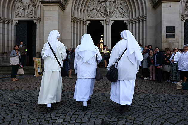 Před katedrálou sv. Václava v Olomouci se scházejí stovky lidí na inauguraci nového arcibiskupa Josefa Nuzíka. (13. dubna 2024)