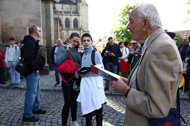 Před katedrálou sv. Václava v Olomouci se scházejí stovky lidí na inauguraci nového arcibiskupa Josefa Nuzíka. (13. dubna 2024)