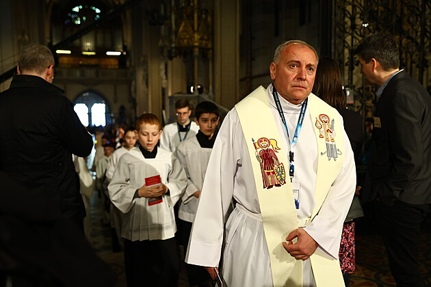 Před katedrálou sv. Václava v Olomouci se scházejí stovky lidí na inauguraci nového arcibiskupa Josefa Nuzíka. (13. dubna 2024)