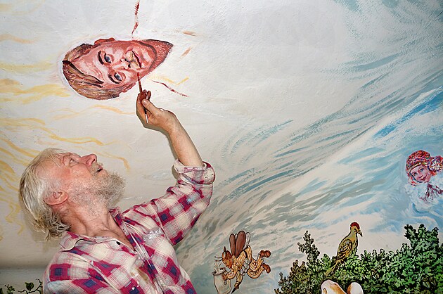 Malíř Petr Herzig Dubický při práci na portrétu Karla Kryla v loštické autobusové čekárně
