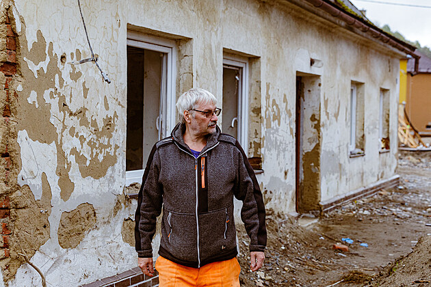 Přítel Pavlíny Eliášové Kamil Böhm z Jeseníku před poškozeným domem, který se sice nemá bourat, ale k bydlení není.