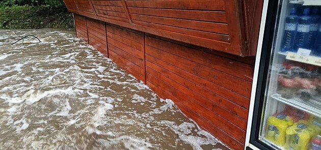Vyplavený areál pstruží farmy Bělá na Opavsku, odkud odplavalo přes tunu pstruhů. (27. září 2024)