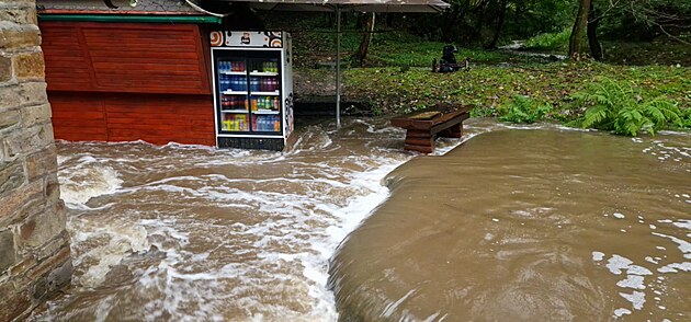 Vyplavený areál pstruží farmy Bělá na Opavsku, odkud odplavalo přes tunu pstruhů. (27. září 2024)