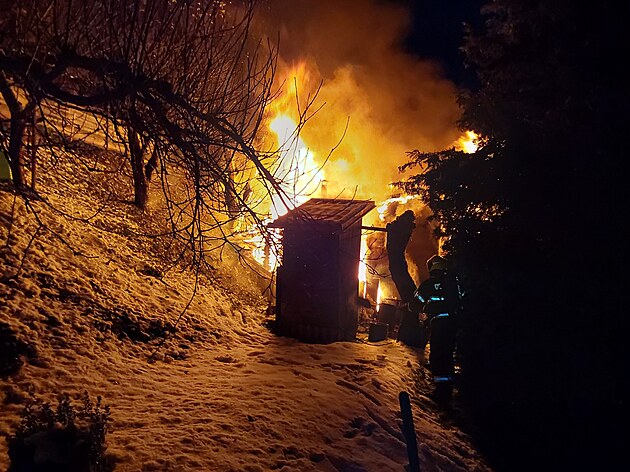 Šumperští hasiči krotí požár dřevěné chaty v zahrádkářské kolonii. (9. prosince 2024)