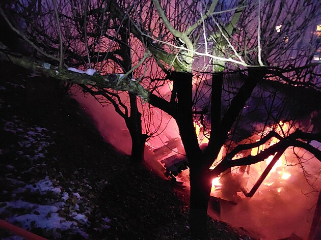 Šumperští hasiči krotí požár dřevěné chaty v zahrádkářské kolonii. (9. prosince 2024)