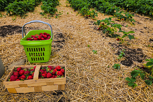 Jahodárna Prostějov pořádá organizované samosběry jahod. Každý sběrač dostane neotrhaný řádek nebo plochu, kterou může vysbírat. (3. července 2024)