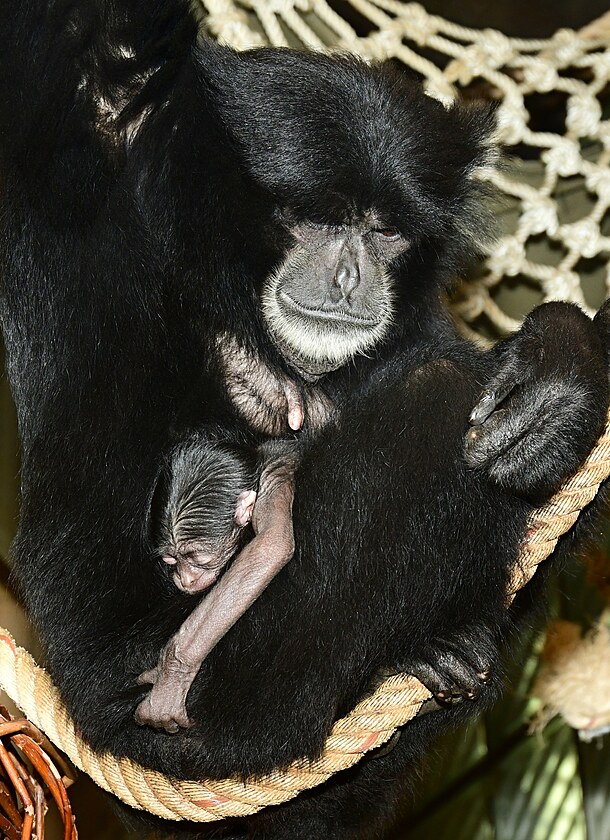 Narozené mládě Siamanga zůstává „přilepené“ na matce až do čtyř měsíců.