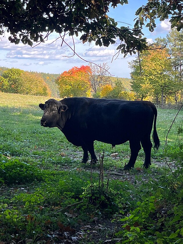 Býk Bohdan, který byl předlohou pro kovovou sochu v nadživotní velikosti od Jana Dostála. (13. října 2025)