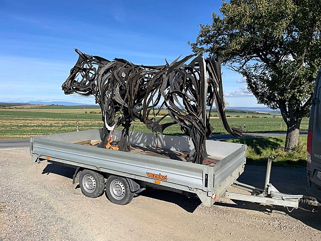 Přeprava sochy býka od sochaře Jana Dostála. (13. října 2025)
