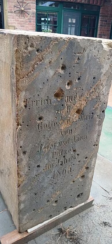 Stopy po válečné střelbě na barokním podstavci sousoší Ukřižováného ve Slavoníně