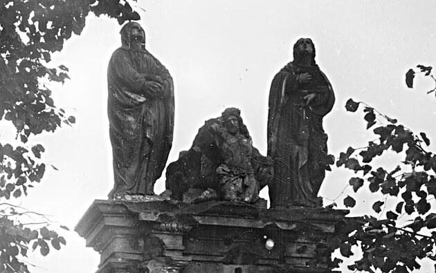 Ztracené sochy na barokním podstavci sousoší Ukřižovaného ve Slavoníně