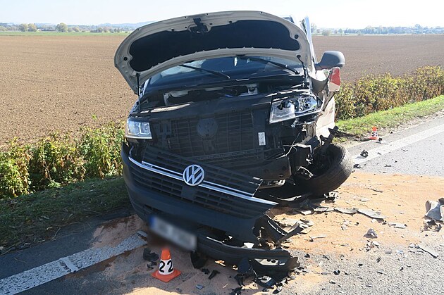 Sanitka po srážce s osobním vozem u Mohelnice. Převážení pacienti ani řidič neutrpěli žádná zranění. (20. října 2025)