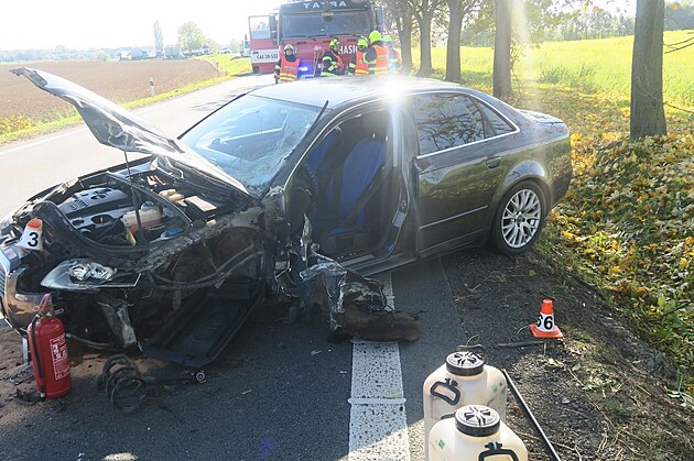 Osobní vůz po srážce se sanitkou u Mohelnice. Převážení pacienti ani řidič sanitky neutrpěli žádná zranění, řidič osobního vozu a spolujezdec jsou zraněni. (20. října 2025)