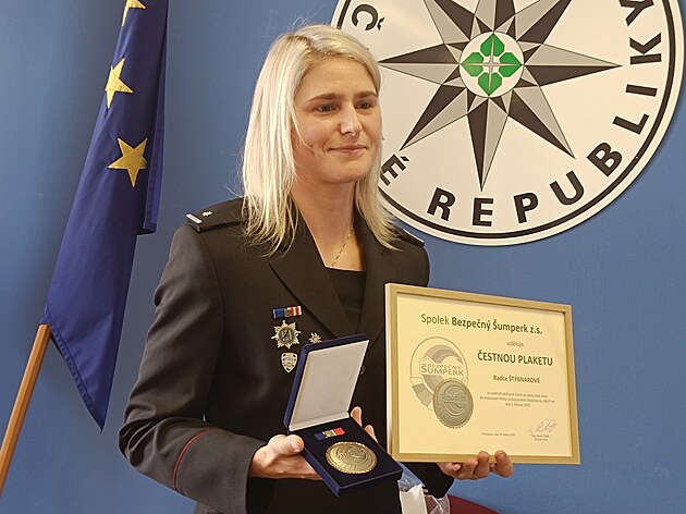 Policistka Radka Štýbnarová z dopravního inspektorátu Šumperk, která v Alpách pomohla zachránit trojici horolezců, převzala čestnou plaketu a medaili za záchranu života.