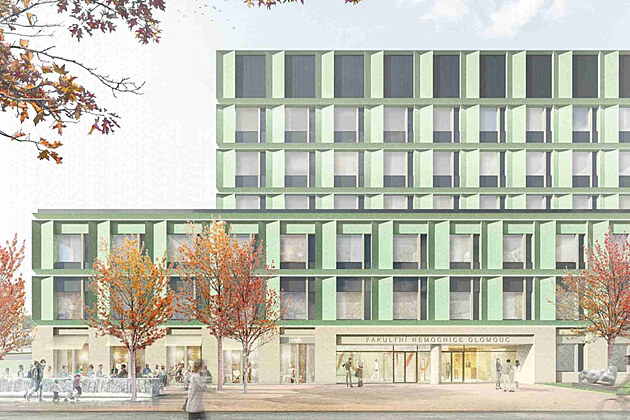 Vizualizace nového pavilonu B za 3,5 miliardy s urgentním příjmem ve Fakultní nemocnici Olomouc. Jeho stavba začala vloni a hotovo má být v roce 2028.