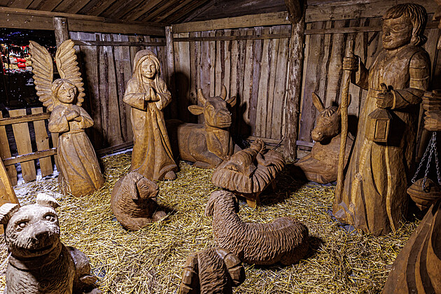 Na olomouckých vánočních trzích opět nechybí vyřezávaný betlém v životní velikosti.