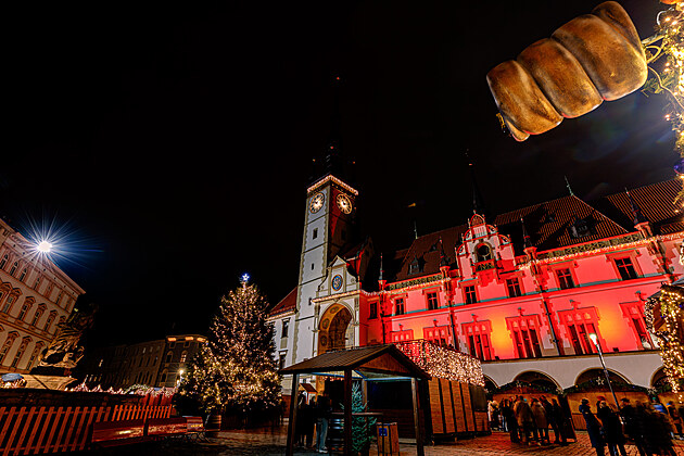 Pohled na olomoucké Horní náměstí s adventními trhy a vánočním stromem, kterým je letos netradičně sekvojovec obrovský.