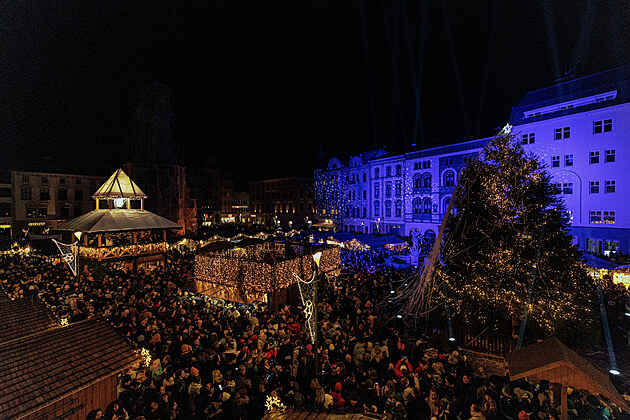 Olomoucké vánoční trhy si lze letos prohlédnout také ze dvou vyhlídek (snímek ze zahájení).