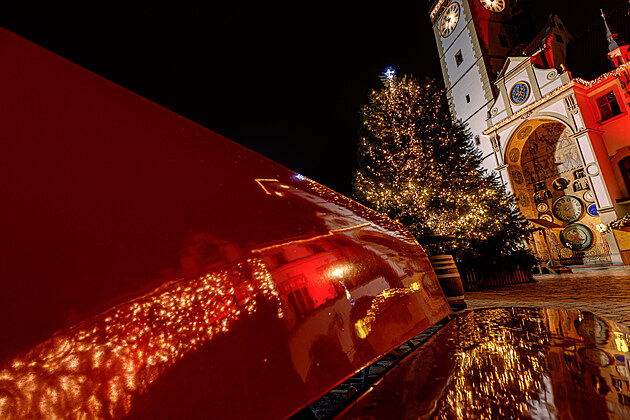 Pohled na olomoucké Horní náměstí s adventními trhy a vánočním stromem, kterým je letos netradičně sekvojovec obrovský.