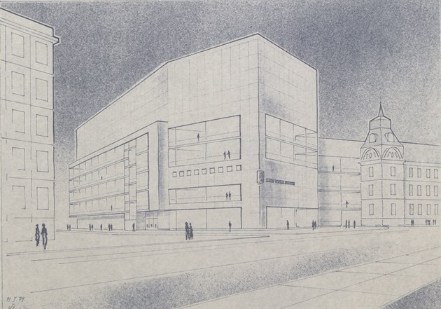 Výsledkem byl Šlapetův návrh dominantní desetipatrové budovy za zhruba padesát milionů korun. Pro sklady architekt vyčlenil šesté až desáté patro, každé na půl milionu svazků. Součástí budovy byl i kulturní sál pro pět set lidí.