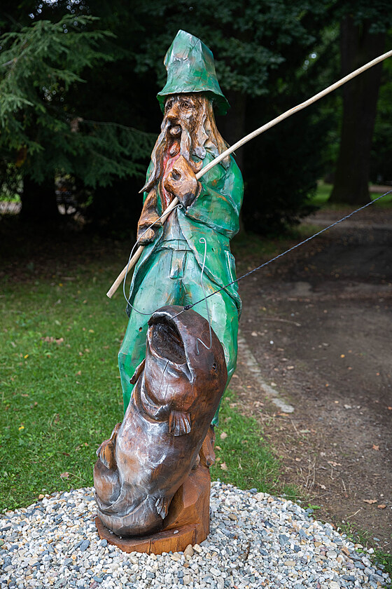 Vodníka, který nově hlídá rybník v parku v Uničově, vyřezal slovenský řezbář Michal Kopásek.