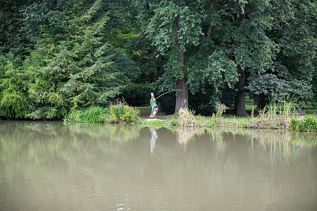 Vodníka, který nově hlídá rybník v parku v Uničově, vyřezal slovenský řezbář Michal Kopásek.