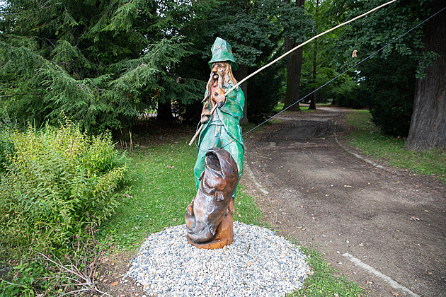Vodníka, který nově hlídá rybník v parku v Uničově, vyřezal slovenský řezbář Michal Kopásek.