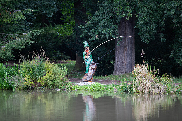 Vodníka, který nově hlídá rybník v parku v Uničově, vyřezal slovenský řezbář Michal Kopásek.