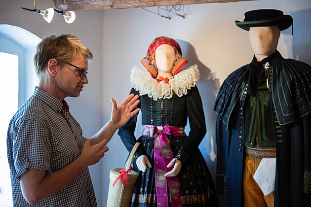 Autor výstavy Hanácký lidový oděv aneb blaťácký kroj v proměnách času Josef Urban vykresluje historii hanáckých krojů.