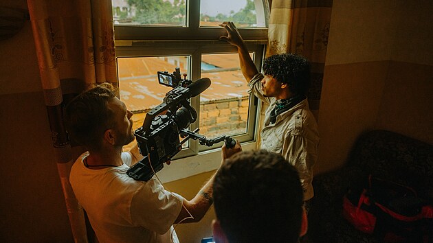 Momentka z natáčení dokumentu Kongo: Cena slona, za nímž stojí olomoucký scenárista a producent Lukáš Hodis. Jedním z hlavních protagonistů je známý český zpěvák Ben Cristovao (na snímku).