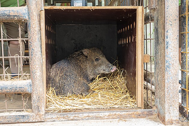 Zoo Olomouc má nový přírůstek. Je jím vzácný pekari bělobradý. Snímek je z přepravy do zoo.