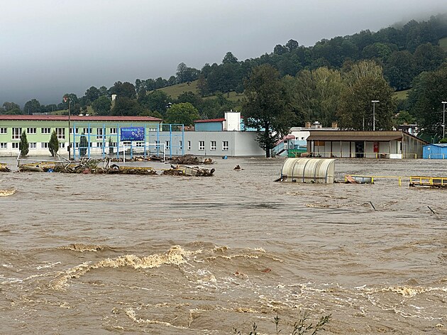 Fotbalové hřiště v České Vsi na Jesenicku skončilo pod vodou.