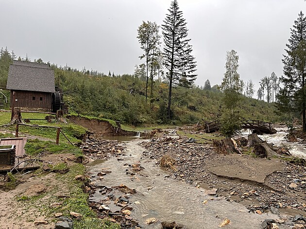Poničený zlatokopecký skanzen ve Zlatých Horách