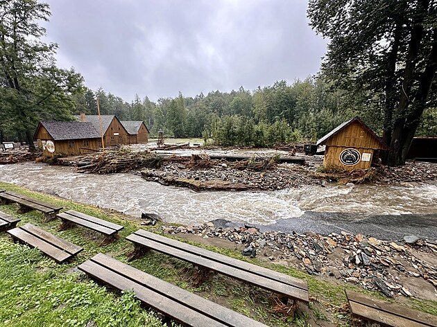 Poničený zlatokopecký skanzen ve Zlatých Horách