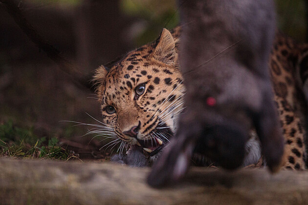 Nová samice levharta mandžuského oslavila v olomoucké zoologické zahradě konec karantény hodováním na králíkovi.
