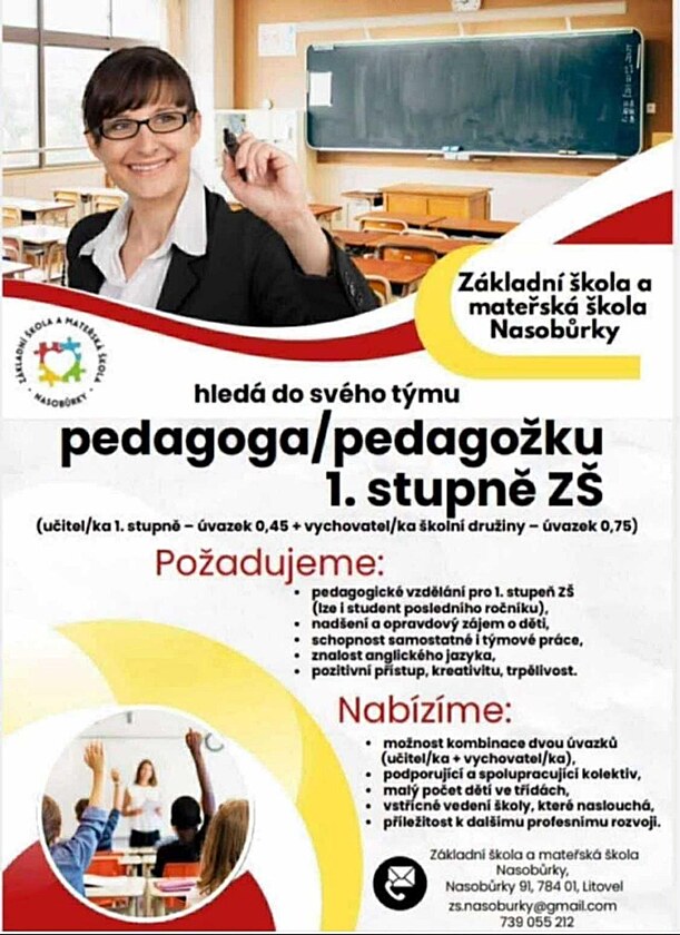 Inzerát města Litovle na učitele prvního stupně pro ZŠ Nasobůrky