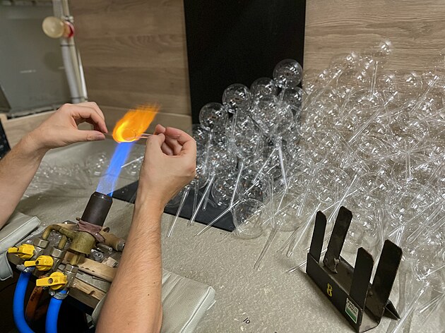 Jeden ze sklářů firmy Koulier tvaruje sklo nad plamenem. (25. září 2025)