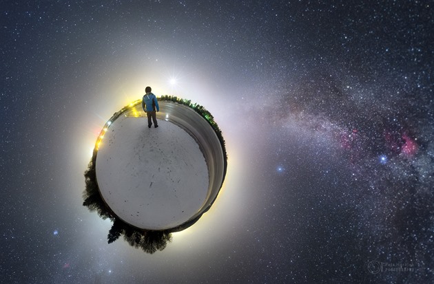 Vidět je také Mléčná dráha a jasné světelné sloupy, které se vytvořily na padajících ledových krystalcích v mrazivém vzduchu. Celek připomíná planetku s Malým princem od Antoina de Saint-Exupéryho.