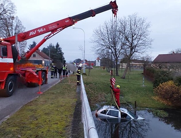 V Libišanech na Pardubicku skončila Škoda Fabia ve požární nádrži. (9. prosince 2024)