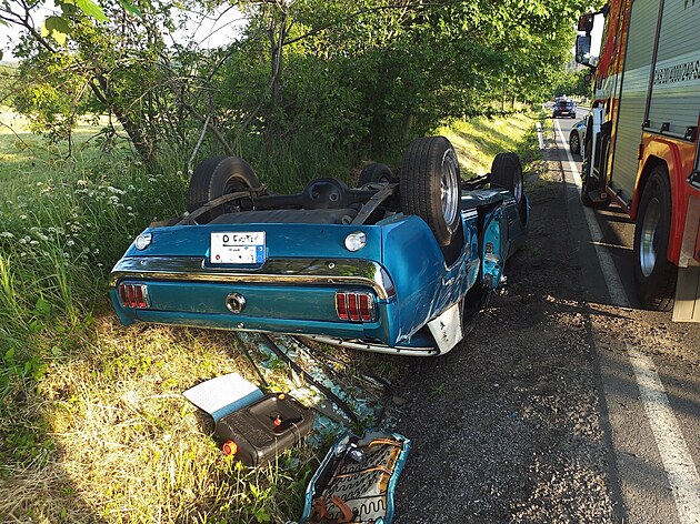 Historický Ford Mustang skončil na střeše u Seče na Chrudimsku. Jeho řidič podle prvotních informací nezvládl předjíždění. (23. června 2025)