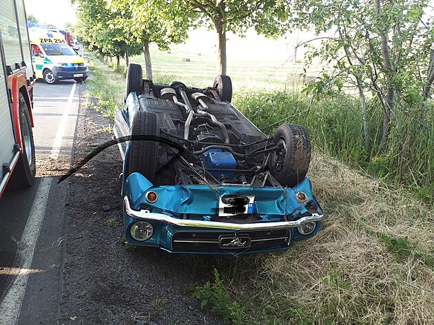Historický Ford Mustang skončil na střeše u Seče na Chrudimsku. Jeho řidič podle prvotních informací nezvládl předjíždění. (23. června 2025)