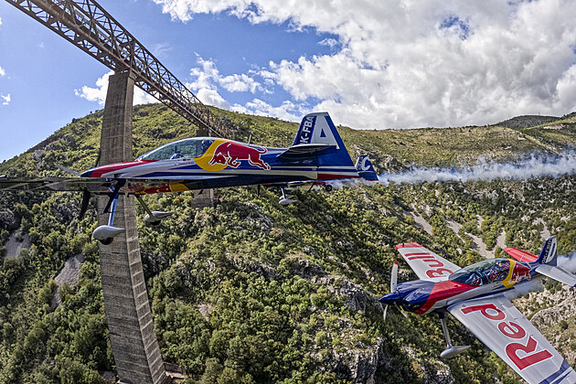 Česká akrobatická skupina Flying Bulls Aerobatics Team jako vůbec první na světě úspěšně absolvovala obrácený skupinový přemet kolem mostu Mala Rijeka v Černé Hoře.