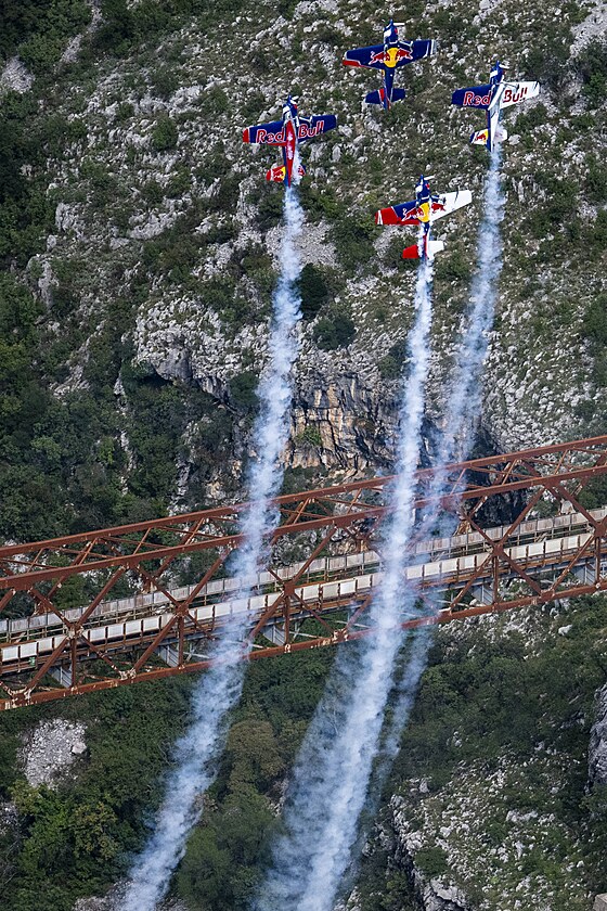 Česká akrobatická skupina Flying Bulls Aerobatics Team jako vůbec první na světě úspěšně absolvovala obrácený skupinový přemet kolem mostu Mala Rijeka v Černé Hoře.