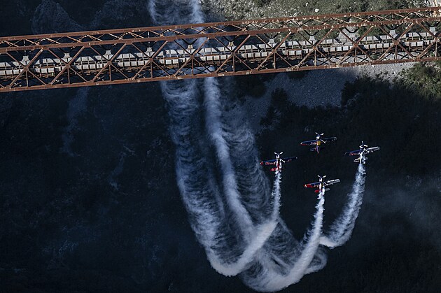 Česká akrobatická skupina Flying Bulls Aerobatics Team jako vůbec první na světě úspěšně absolvovala obrácený skupinový přemet kolem mostu Mala Rijeka v Černé Hoře.