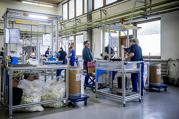 Plnění pytlů bezdýmým prachem. Ten je přesně odvážen.
