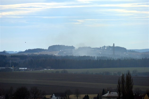 Šedý kouř stoupající od místa výbuchu v areálu Poličských strojíren. (23. února 2017)