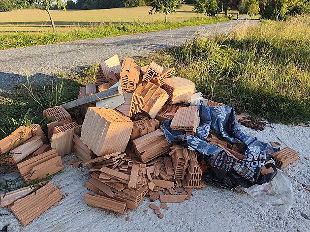 Na opuštěném staveništi zůstala jen kupa rozbitých cihel, dřeva, pytlů a zbytků izolace, které vítr roznáší po okolí. (6. října 2025)